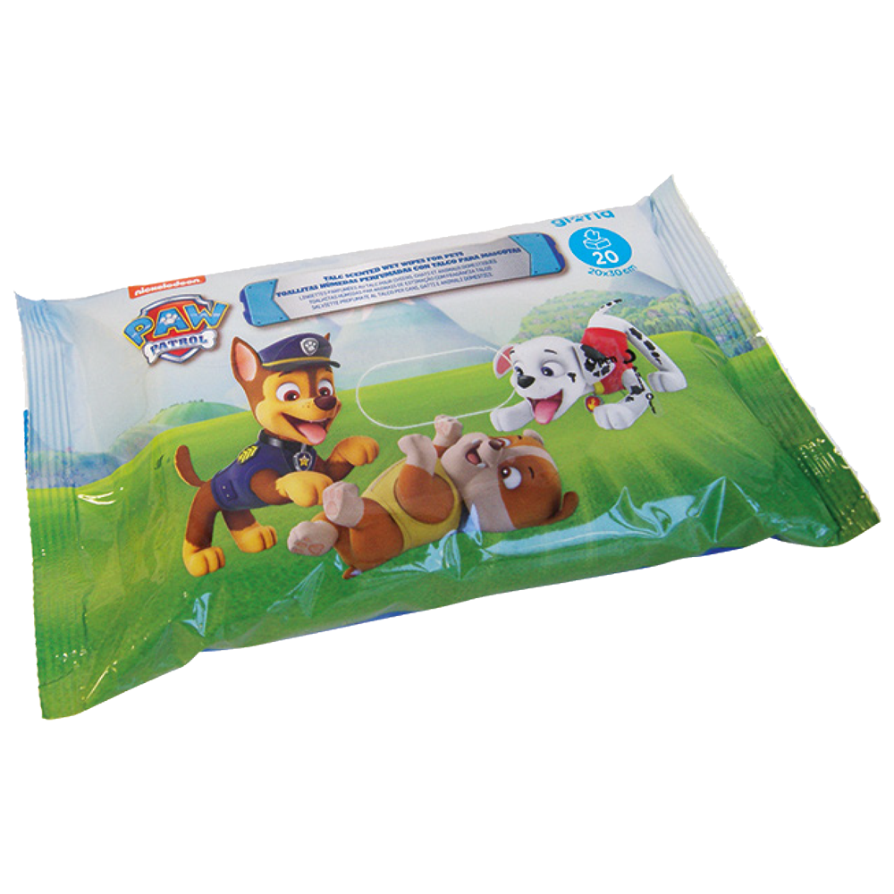 Le Salviette Paw Patrol al Talco detergono e lucidano il pelo di cani, gatti e animali domestici 🐾.