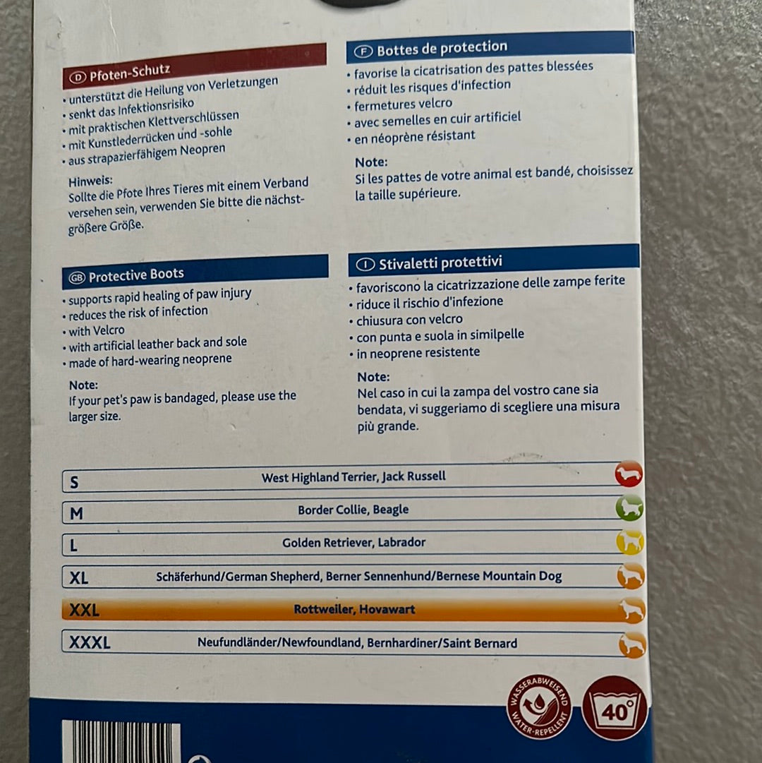 - Il materiale della scarpa è realizzato in softshell impermeabile, così la zampa del vostro cane rimane sempre calda e asciutta in caso di bagnato. Grazie agli elementi riflettenti sulla chiusura in velcro, il vostro cane rimane ben visibile anche al crepuscolo/buio